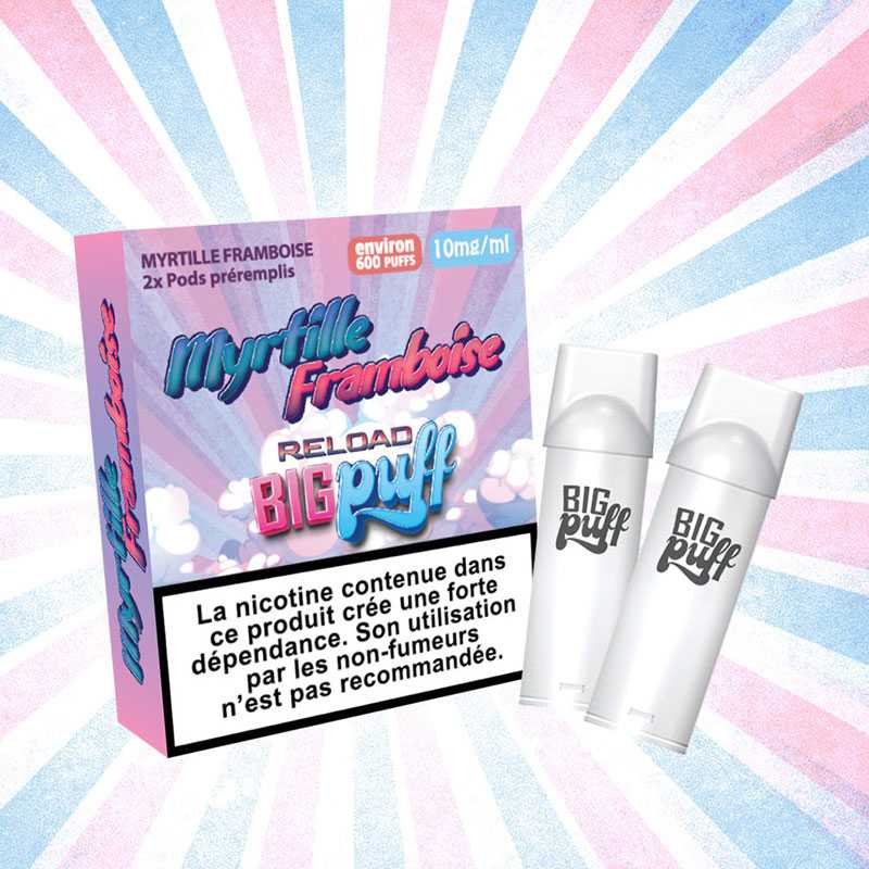 Pack de deux cartouches Myrtille framboise pour la puff rechargeable Big Puff Reload. Saveur(s) : Myrtille, Framboise. Chaque recharge offre une contenance de 2 ml, avec ou sans nicotine, permettant jusqu’à 600 bouffées.