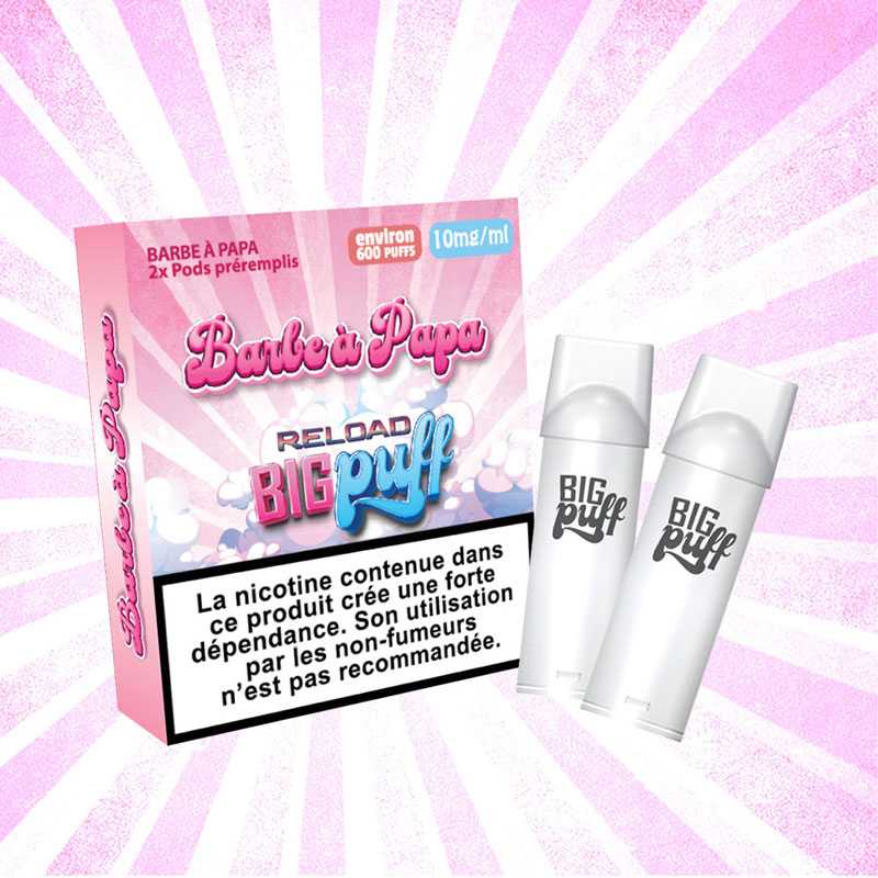 Pack de deux cartouches Barbe à Papa pour la puff rechargeable Big Puff Reload. Saveur(s) : Barbe à papa. Chaque recharge offre une contenance de 2 ml, avec ou sans nicotine, permettant jusqu’à 600 bouffées.
