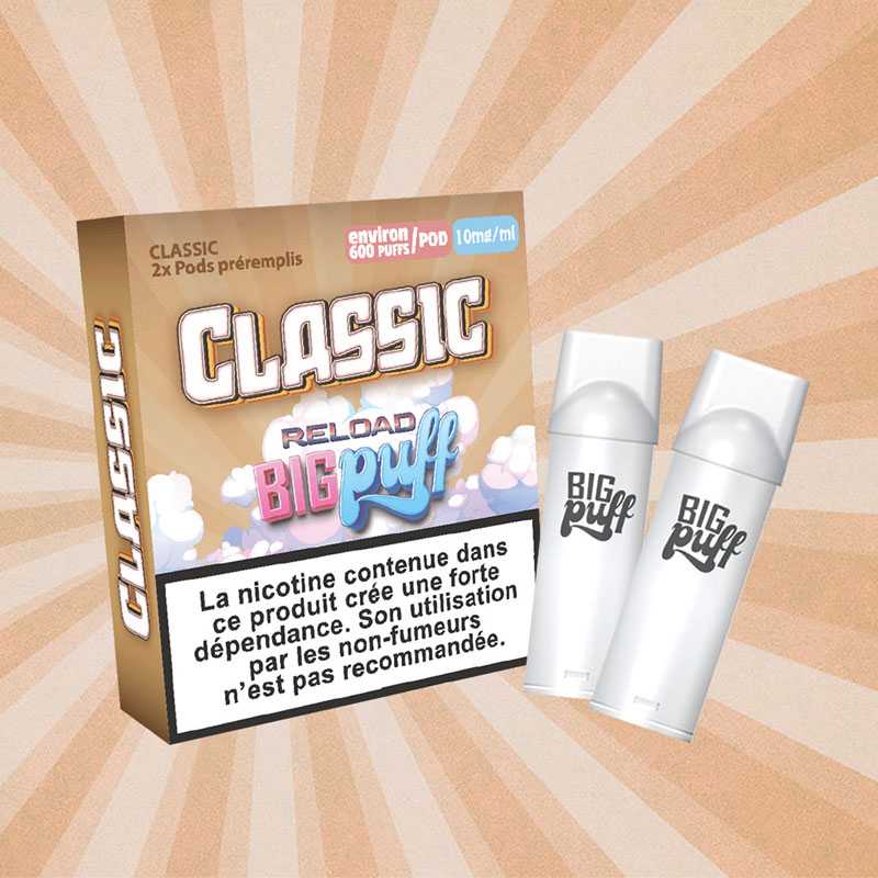 Pack de deux cartouches Classic pour la puff rechargeable Big Puff Reload. Saveur(s) : Classic Blond. Chaque recharge offre une contenance de 2 ml, avec ou sans nicotine, permettant jusqu’à 600 bouffées.