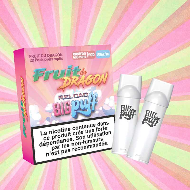 Pack de deux cartouches Fruit du Dragon pour la puff rechargeable Big Puff Reload. Saveur(s) : Fruit du dragon. Chaque recharge offre une contenance de 2 ml, avec ou sans nicotine, permettant jusqu’à 600 bouffées.