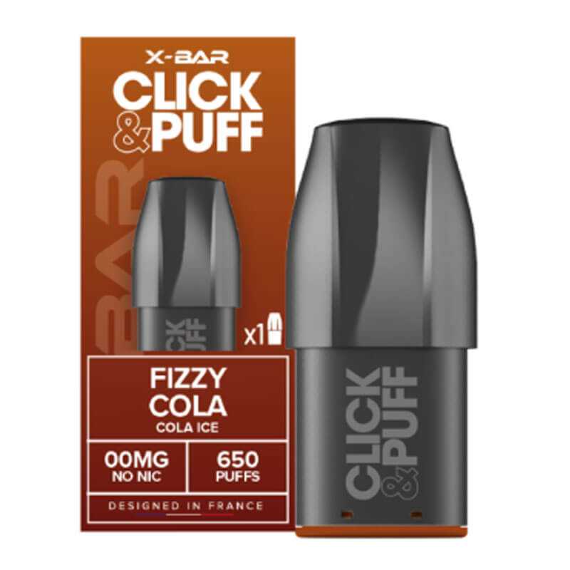 1 cartouche Fizzy Cola pour la puff rechargeable Click & Puff 650R X-Bar du French Lab. Saveur(s) : Frais, Cola. Disponible en 0mg, 10mg et 20mg de nicotine - 650 bouffées par recharge.
