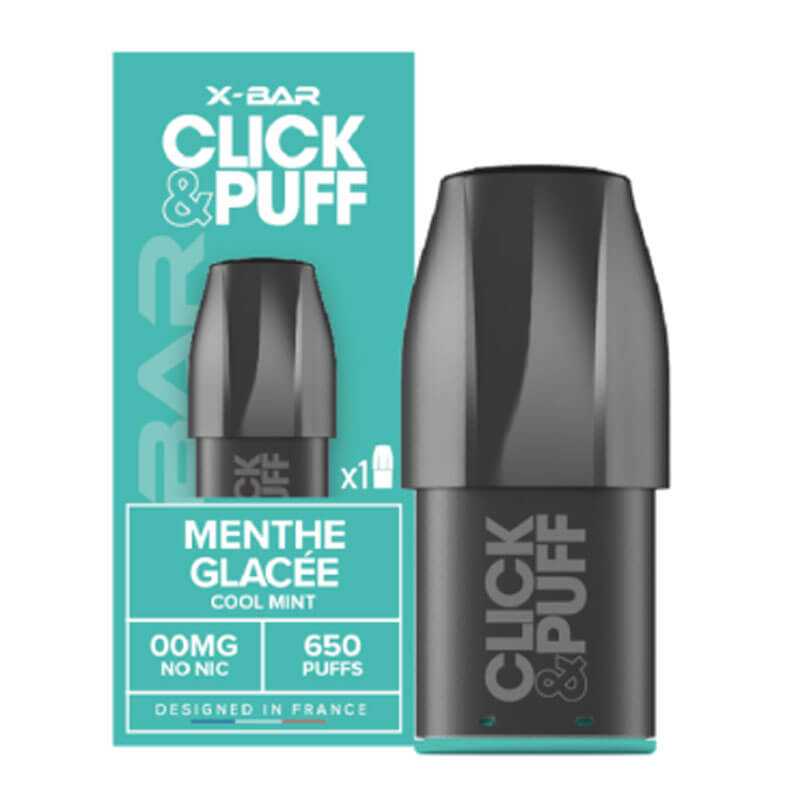 1 cartouche Menthe Glacée pour la puff rechargeable Click & Puff 650R X-Bar du French Lab. Saveur(s) : Frais, Menthe. Disponible en 0mg, 10mg et 20mg de nicotine - 650 bouffées par recharge.