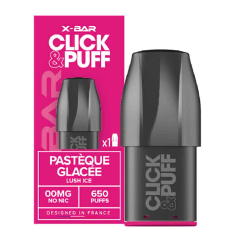 1 cartouche Pastèque glacé pour la puff rechargeable Click & Puff 650R X-Bar du French Lab. Saveur(s) : Pastèque, Frais. Disponible en 0mg, 10mg et 20mg de nicotine - 650 bouffées par recharge.