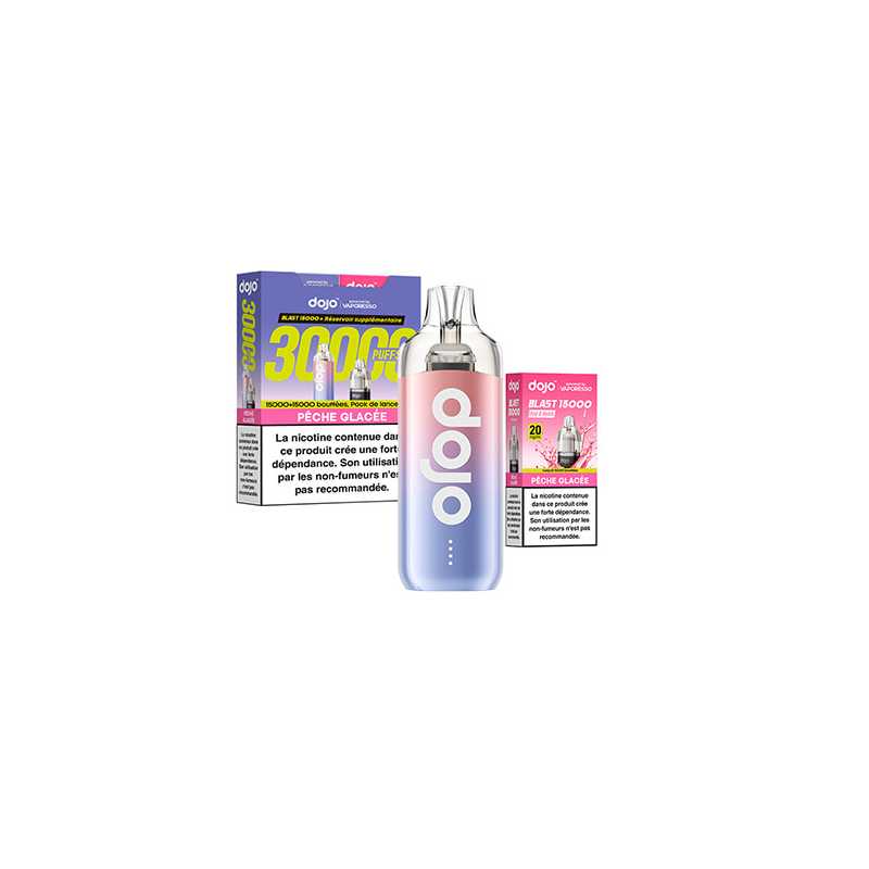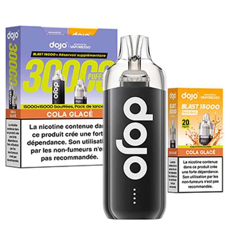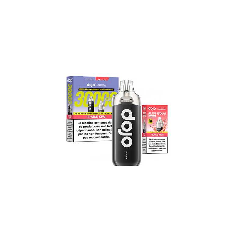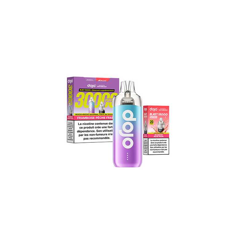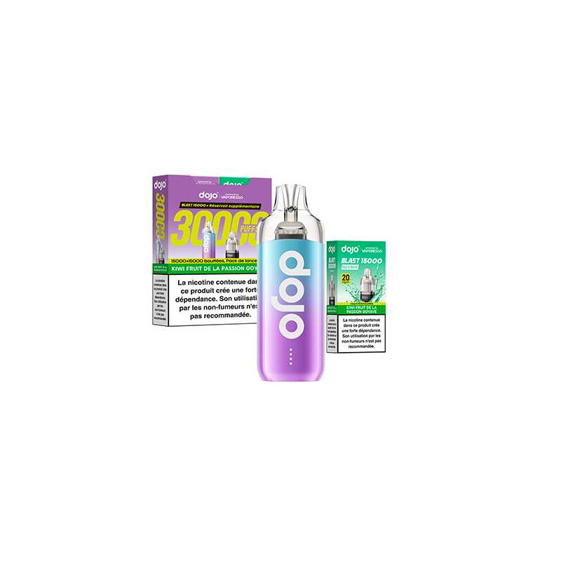 Découvrez le kit Dojo Blast 30K par Vaporesso : une puff rechargeable avec 2 cartouches de 10 ml, jusqu’à 30 000 bouffées (15 000 + 15 000). Batterie 1000 mAh, activation automatique, système anti-fuite, format compact, 20 mg/ml de nicotine en sels. Simple, durable, sans réglage.