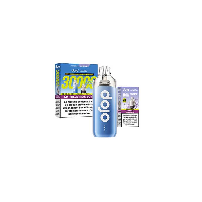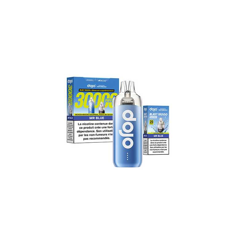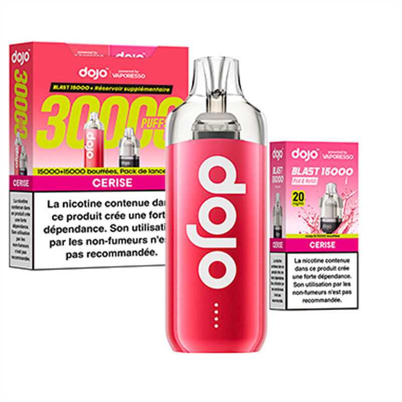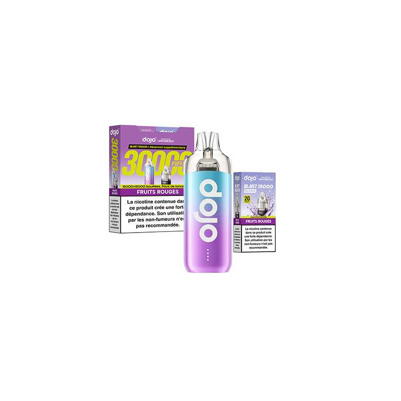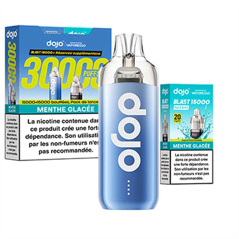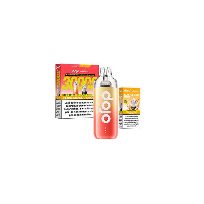 Découvrez le kit Dojo Blast 30K par Vaporesso : une puff rechargeable avec 2 cartouches de 10 ml, jusqu’à 30 000 bouffées (15 000 + 15 000). Batterie 1000 mAh, activation automatique, système anti-fuite, format compact, 20 mg/ml de nicotine en sels. Simple, durable, sans réglage.