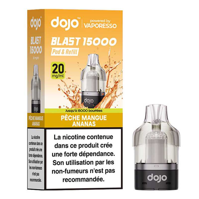 Cartouche Pêche Mangue Ananas Dojo Blast 15K pour la puff rechargeable Dojo Blast 30K de Vaporesso. Saveur : Pêche Mangue Ananas.