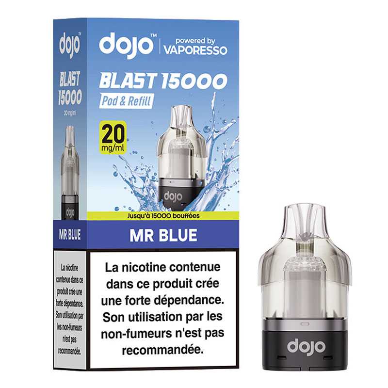 Le pod Dojo Blast 15K dispose d'un réservoir pré-rempli à 10ml de la saveur Mr Blue, proposée en 20mg de liquide aux sels de nicotine. Chaque réservoir délivre jusqu'à 15 000 bouffées et s'utilise sur la batterie Dojo Blast.