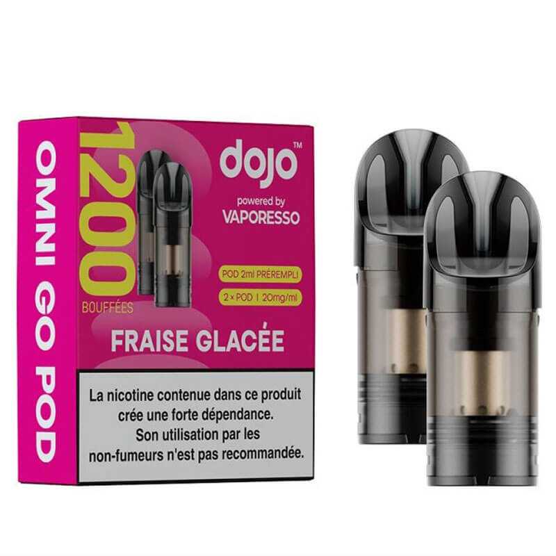 2 cartouches Fraise Glacée pour la puff rechargeable Dojo Omni Go de Vaporesso. Saveur(s) : Fraise, Frais. Disponible en 20mg de nicotine - 600 bouffées par recharge.