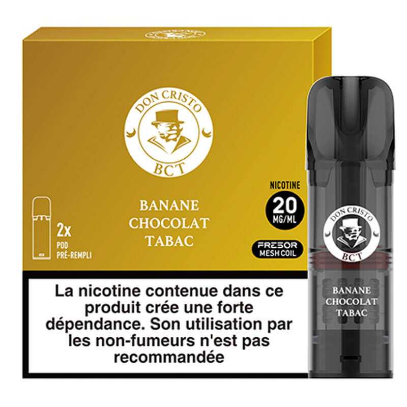 Pack de deux cartouches BCT pour la puff rechargeable Don Cristo de PGVG Labs. Saveur(s) : Chocolat, Banane, Classic Blond. Contenance 2 x 2ml avec nicotine. 600 bouffées par recharge. Compatible avec les batteries Elfa, Tappo Air, Repuff, El Bullet et R-BAR.