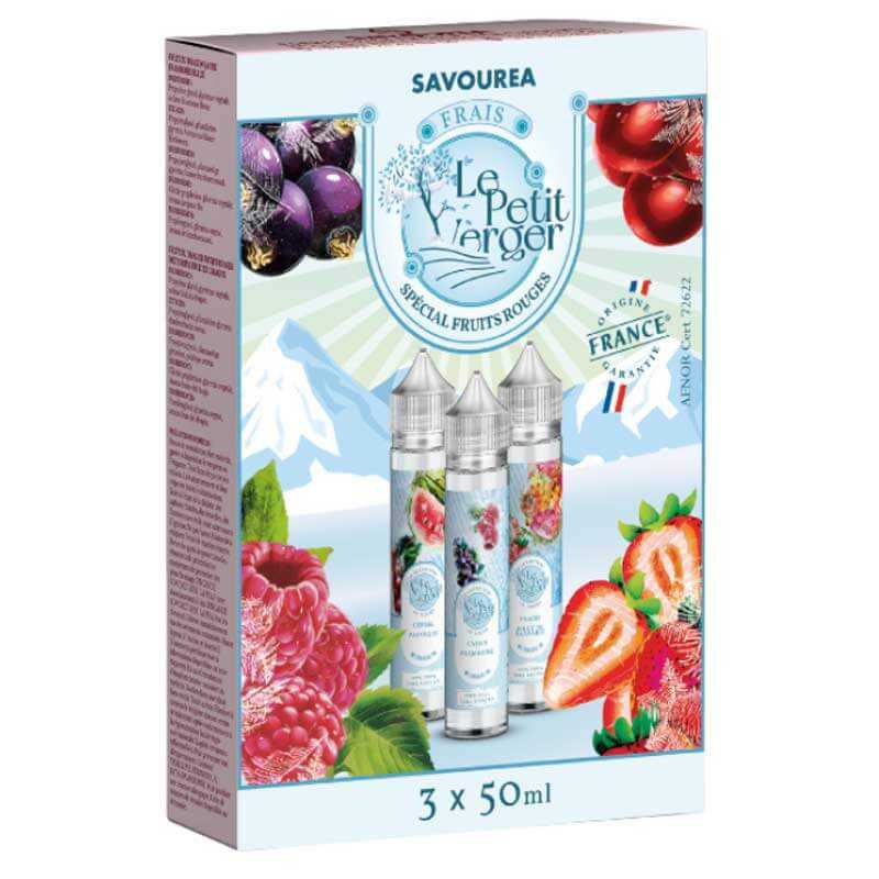 Le Petit Verger est une marque française spécialisée dans la fabrication d’e-liquides. Ce pack regroupe trois produits au format 50 ml, conçus sur une base fruitée avec une dominante de fruits rouges et un effet frais.