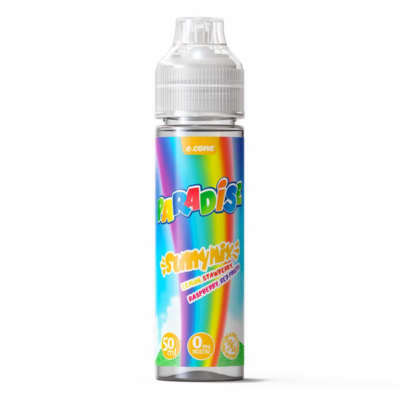Découvrez le e liquide Sunny Mix Paradise E-CONE 50 ml. Saveur(s) : Citron, Framboise, Glace, Fraise, Fruits rouges. Le e liquide Vape Maker est formulé dans un flacon de 50 ml sans nicotine et peut contenir jusqu'à 70 ml de e liquide après l'ajout de deux boosters.
