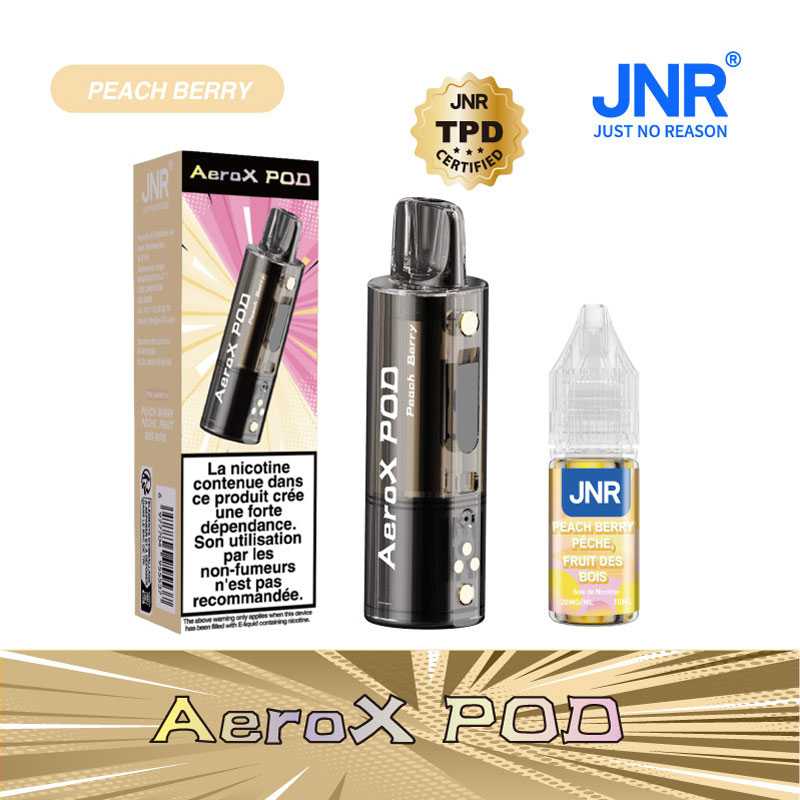 Cartouche Peach Berry pour la puff rechargeable Aerox 32K de JNR. Saveur(s) : Peach Berry. Le pack JNR AeroX inclut une cartouche rechargeable et un e-liquide Peach Berry 10mL Nic Salt 20mg.
