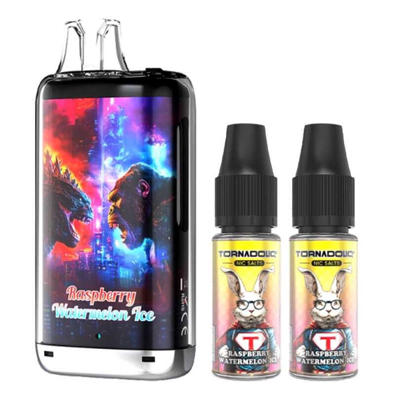 La puff remplissable Framboise Pastèque Frais Kong Max 30k est fabriqué par Gobar et compatible avec tous les e-liquides de la gamme Tornadoliq.