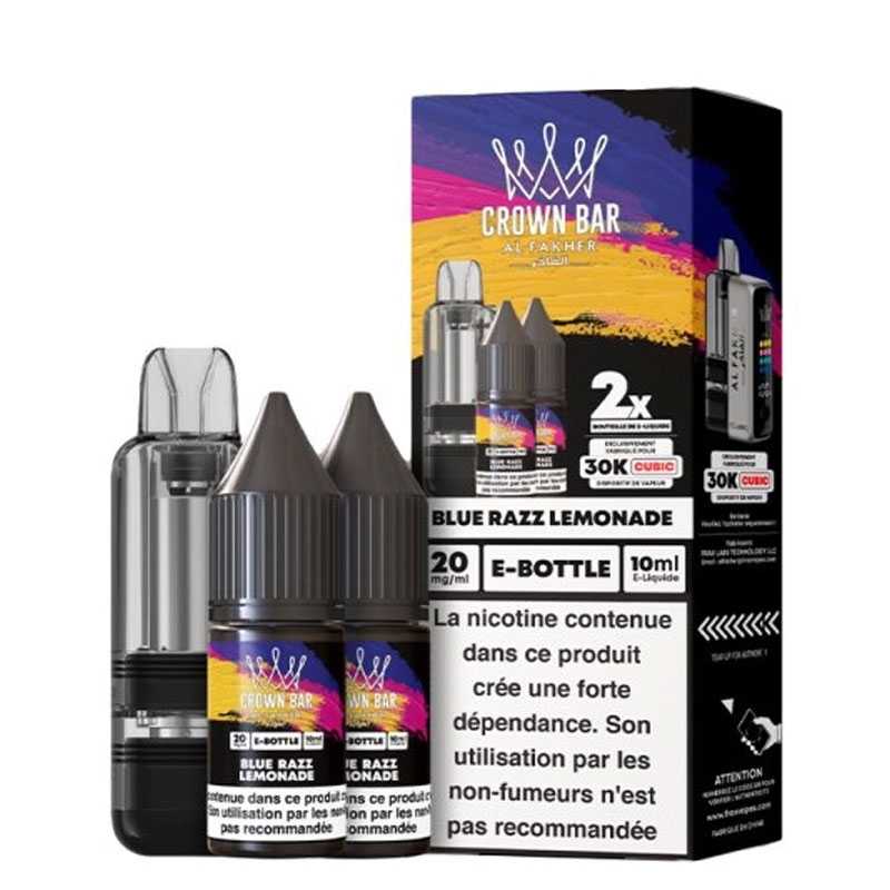 La cartouche Cubic 30K Crown Bar – Blue Razz Lemonade est conçue pour être utilisée exclusivement avec la batterie Cubic 30K Crown Bar de la marque Al Fakher. Elle dispose d’un réservoir de 2 ml, rechargeable à l’aide de deux flacons de 10 ml de e-liquide fournis lors de l’achat. L’ensemble permet une autonomie estimée à 30 000 bouffées, selon l’usage.