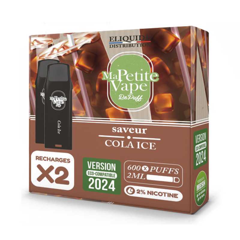 Pack de deux cartouches Cola Ice pour la puff rechargeable RePuff de Ma Petite Vape. Saveur(s) : Frais, Cola. Disponible en 10mg et 20mg de nicotine - 600 bouffées par recharge.