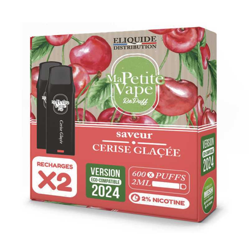 Pack de deux cartouches Cerise Glacée pour la puff rechargeable RePuff de Ma Petite Vape. Saveur(s) : Frais, Cerise. Disponible en 10mg et 20mg de nicotine - 600 bouffées par recharge.