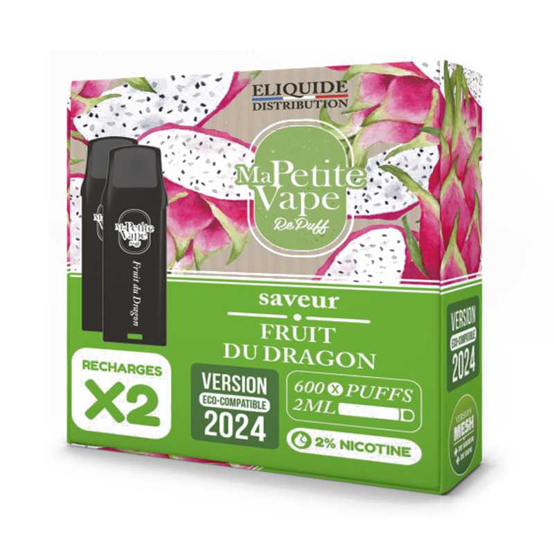 Pack de deux cartouches Fruit du Dragon pour la puff rechargeable RePuff de Ma Petite Vape. Saveur(s) : Fruit du dragon. Disponible en 10mg et 20mg de nicotine - 600 bouffées par recharge.