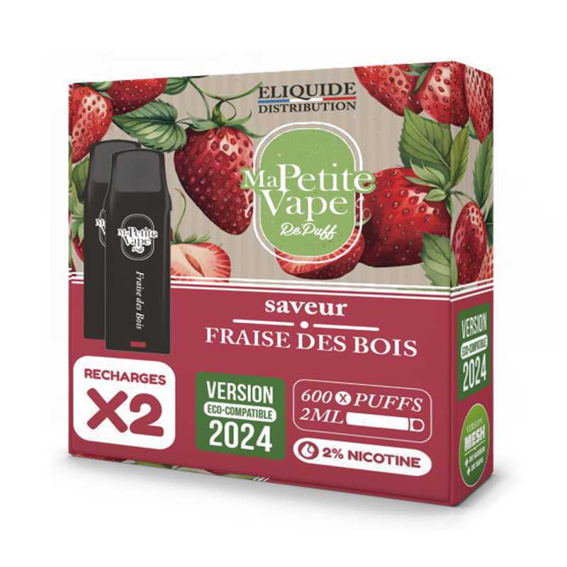 Pack de deux cartouches Fraise des Bois pour la puff rechargeable RePuff de Ma Petite Vape. Saveur(s) : Fraise. Disponible en 10mg et 20mg de nicotine - 600 bouffées par recharge.