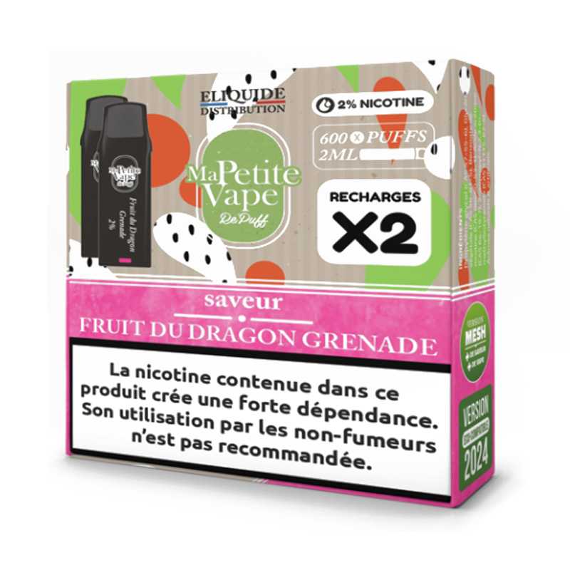 Pack de deux cartouches Fruit du Dragon Grenade pour la puff rechargeable RePuff de Ma Petite Vape. Saveur(s) : Grenade, Fruit du dragon. Disponible en 10mg et 20mg de nicotine - 600 bouffées par recharge.