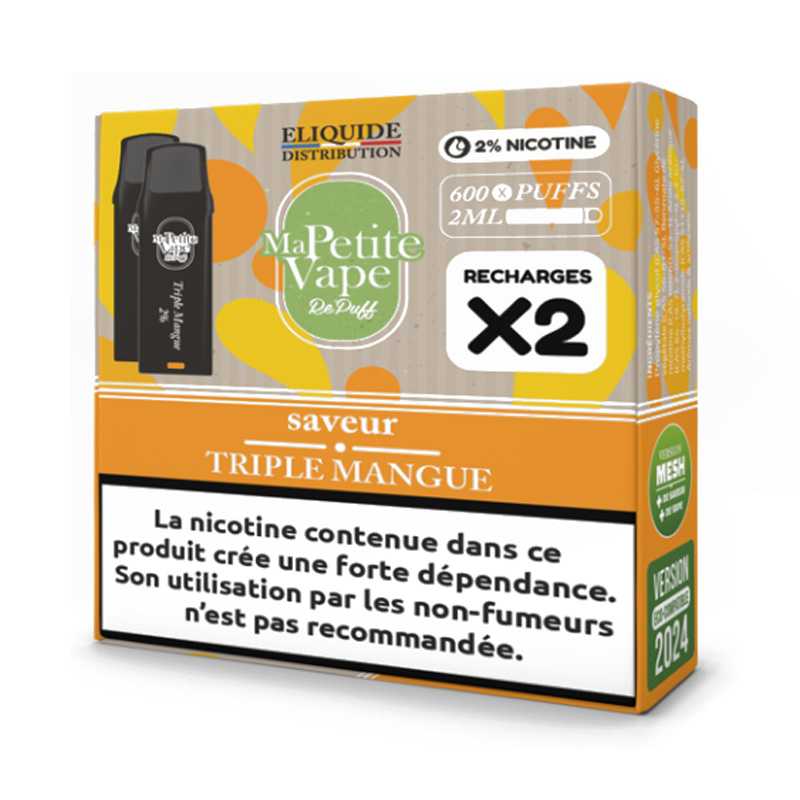 Pack de deux cartouches Triple Mangue pour la puff rechargeable RePuff de Ma Petite Vape. Saveur(s) : Mangue. Disponible en 10mg et 20mg de nicotine - 600 bouffées par recharge.