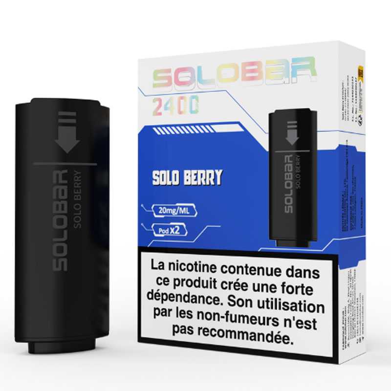 Pack de 2 cartouches Solo Berry pour la puff rechargeable Solobar 2400 de Solobar. Saveur : Baies. Contenance 2 x 2ml, avec nicotine. Environ 600 bouffées par recharge.