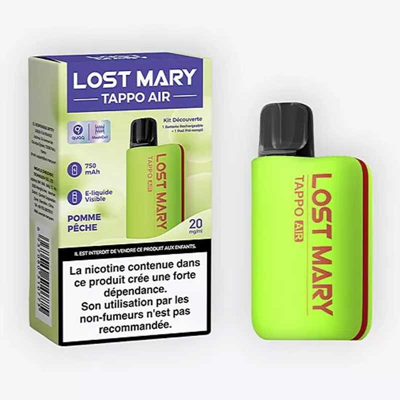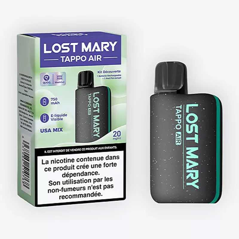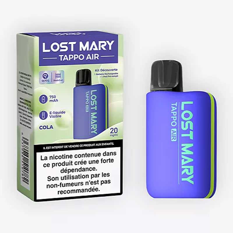 Découvrez le Kit Tappo Air Lost Mary chez EliquidAndCo, comprenant une batterie rechargeable de 750mAh et un Pod pré-rempli de 2ml de liquide en sel de nicotine. Profitez de la simplicité d'un pod jetable, mais rechargeable au même prix, avec la possibilité de changer de saveur tout en conservant la même batterie. Choisissez parmi 6 coloris de batterie, chacun associé à une saveur, comme le Cola, la Fraise Framboise, les Fruits Tropicaux, la Pomme Pêche, la Pastèque, et le USA Mix (Tabac blond américain).