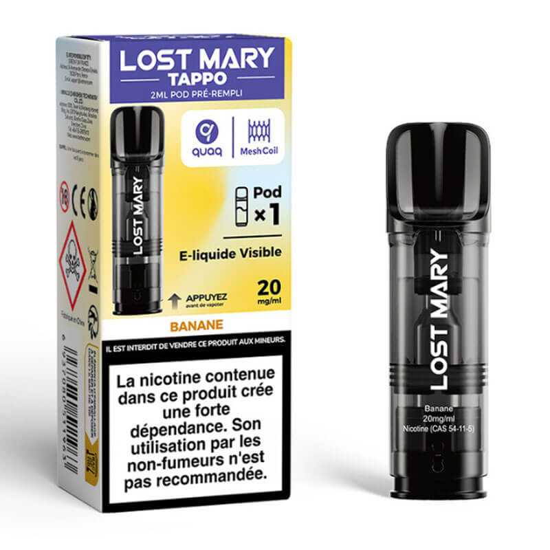 1 cartouche Banane pour la puff rechargeable Tappo Air de Lost Mary. Saveur(s) : Banane. Chaque recharge offre une contenance de 2 ml, avec ou sans nicotine, permettant jusqu’à 600 bouffées.