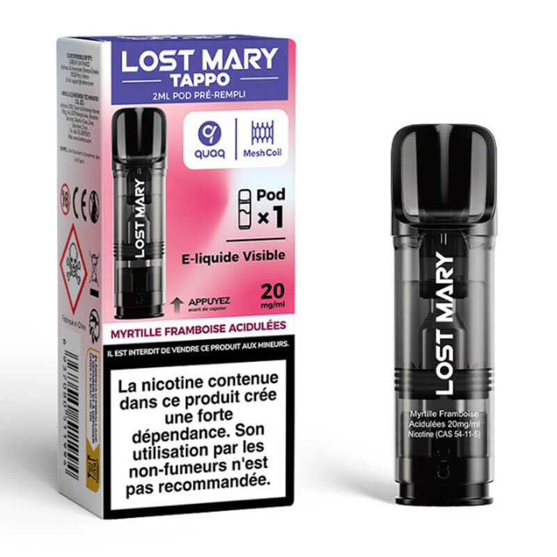1 cartouche Myrtille Framboise Acidulées pour la puff rechargeable Tappo Air de Lost Mary. Saveur(s) : Framboise, Myrtille. Chaque recharge offre une contenance de 2 ml, avec ou sans nicotine, permettant jusqu’à 600 bouffées.