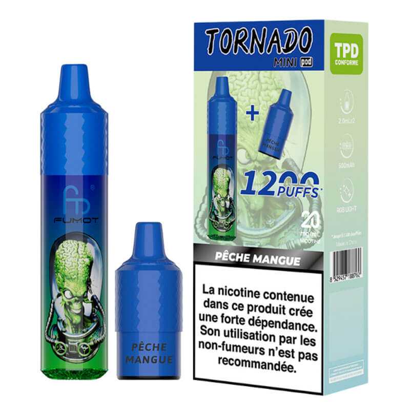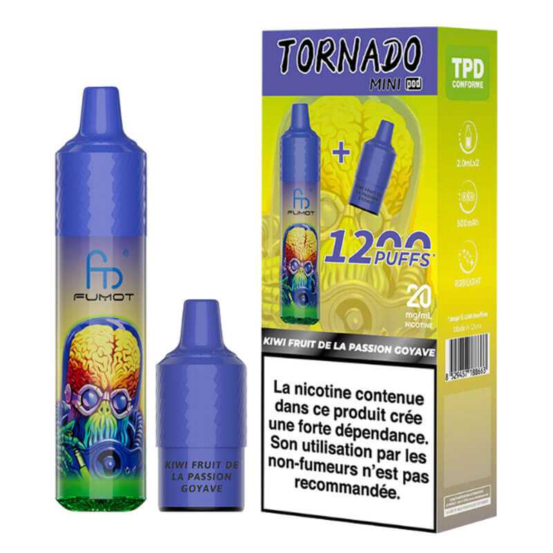 Le Kit Tornado Mini 1200 de Fumot est une cigarette électronique conçu pour une utilisation simple et nomade. Il se compose d’une batterie intégrée de 500mAh, rechargeable via un port USB-C, et de deux cartouches préremplies de 2ml chacune. Ces pods contiennent 20mg de sels de nicotine. Le kit fonctionne sans bouton ni réglage : l’activation se fait automatiquement à l’inhalation.
