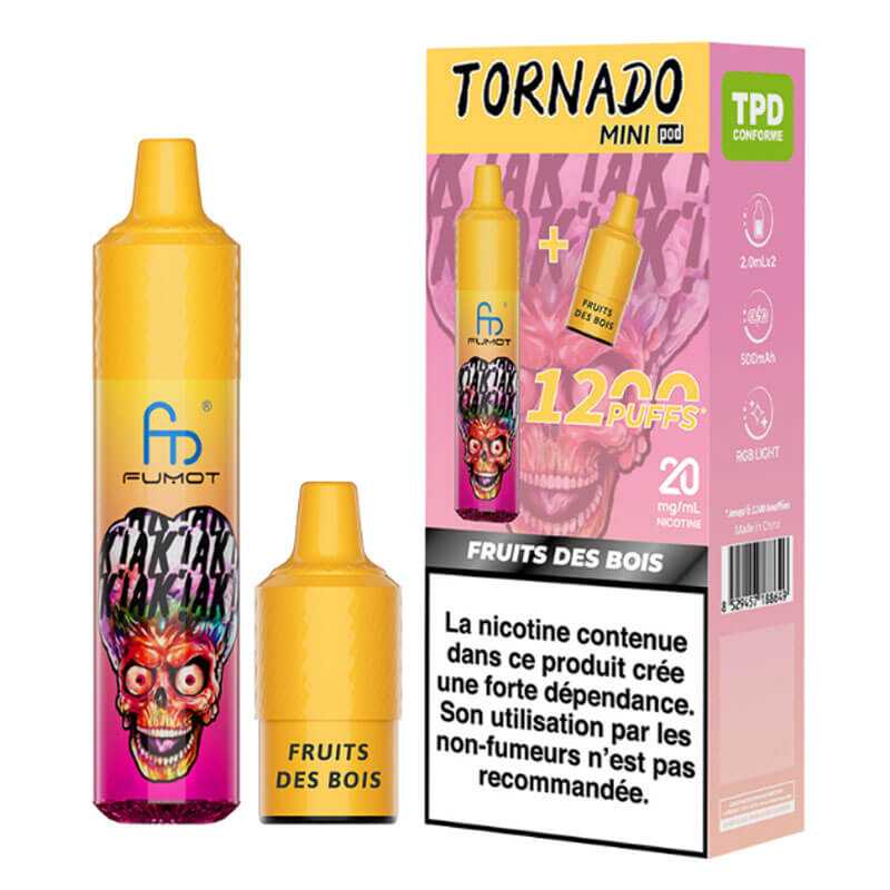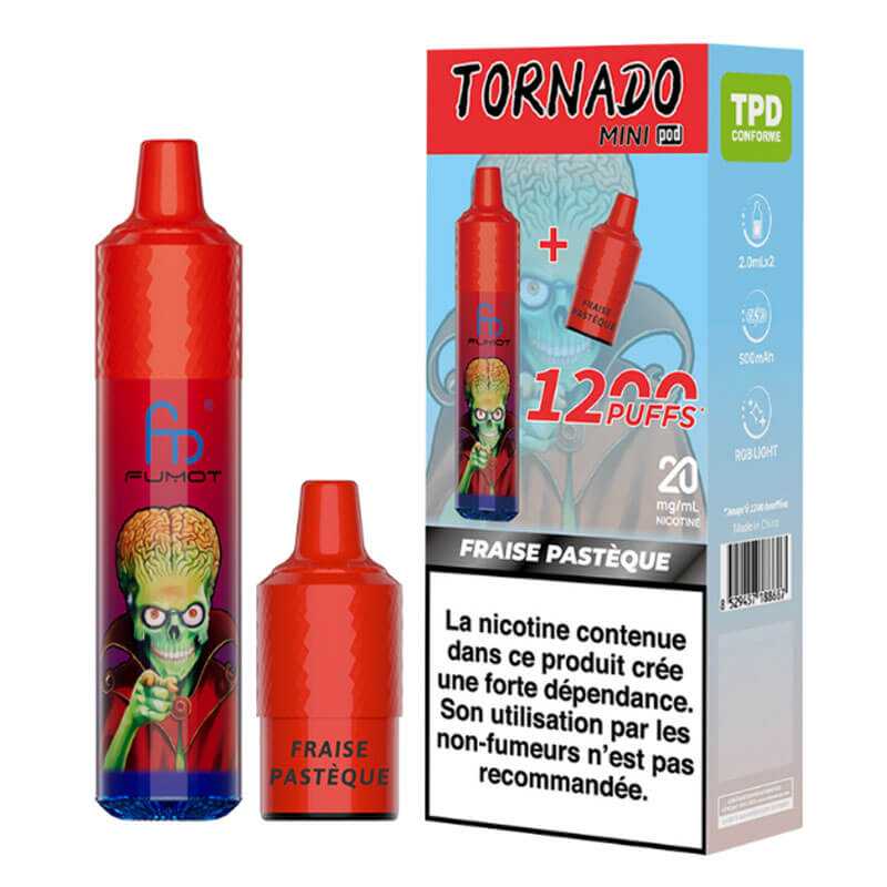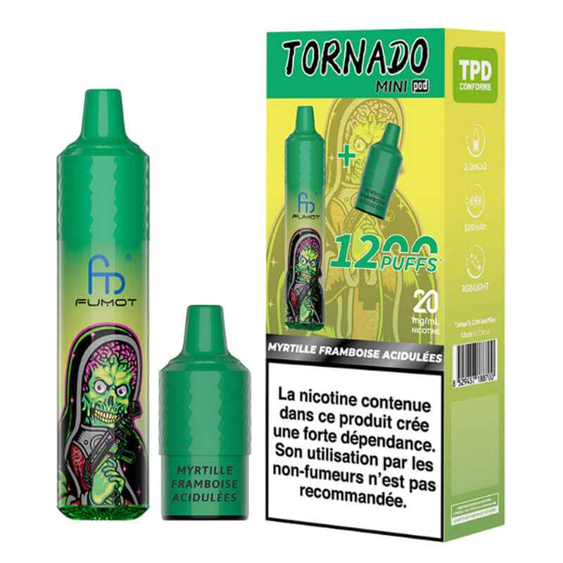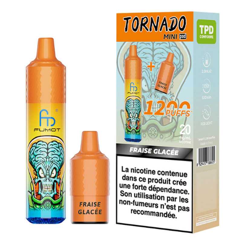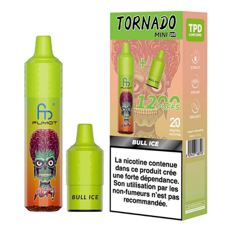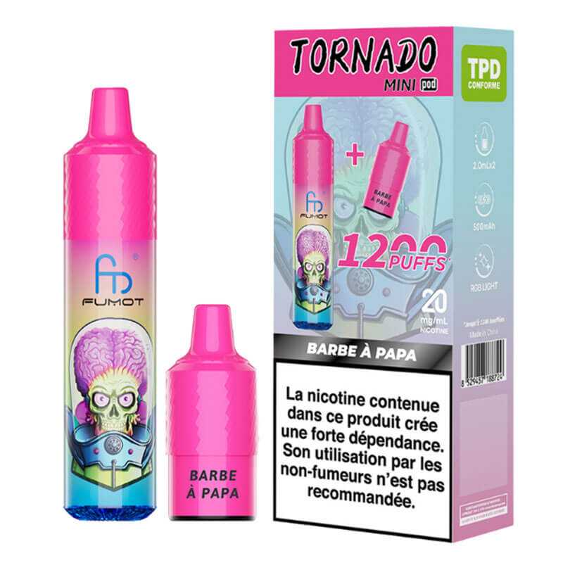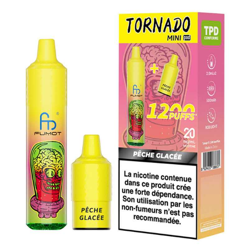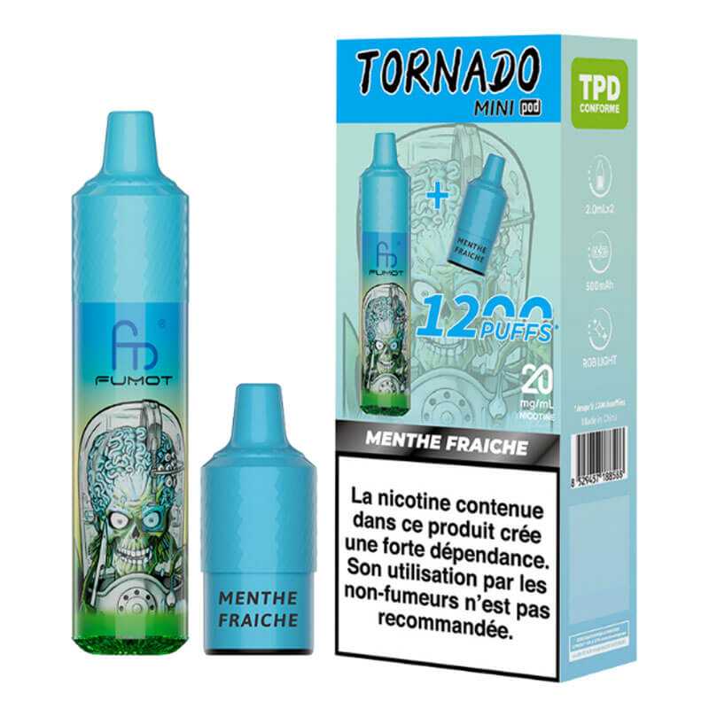 Le Kit Tornado Mini 1200 de Fumot est un dispositif compact avec batterie rechargeable 500mAh. Il inclut 2 pods préremplis de 2ml (20mg sels de nicotine) et permet jusqu’à 1200 bouffées estimées. Activation automatique, sans bouton ni réglage.