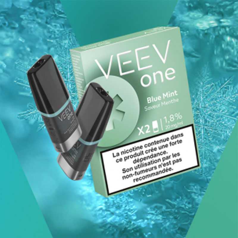 Pack de deux cartouches Blue Mint pour la puff rechargeable Veev One de VEEV. Saveur(s) : Menthe, Frais. Contenance 2 x 2ml avec nicotine. 1000 bouffées par recharge.