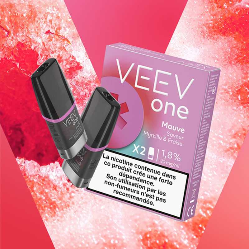 Pack de deux cartouches Mauve pour la puff rechargeable Veev One de VEEV. Saveur(s) : Myrtille, Fraise. Contenance 2 x 2ml avec nicotine. 1000 bouffées par recharge.