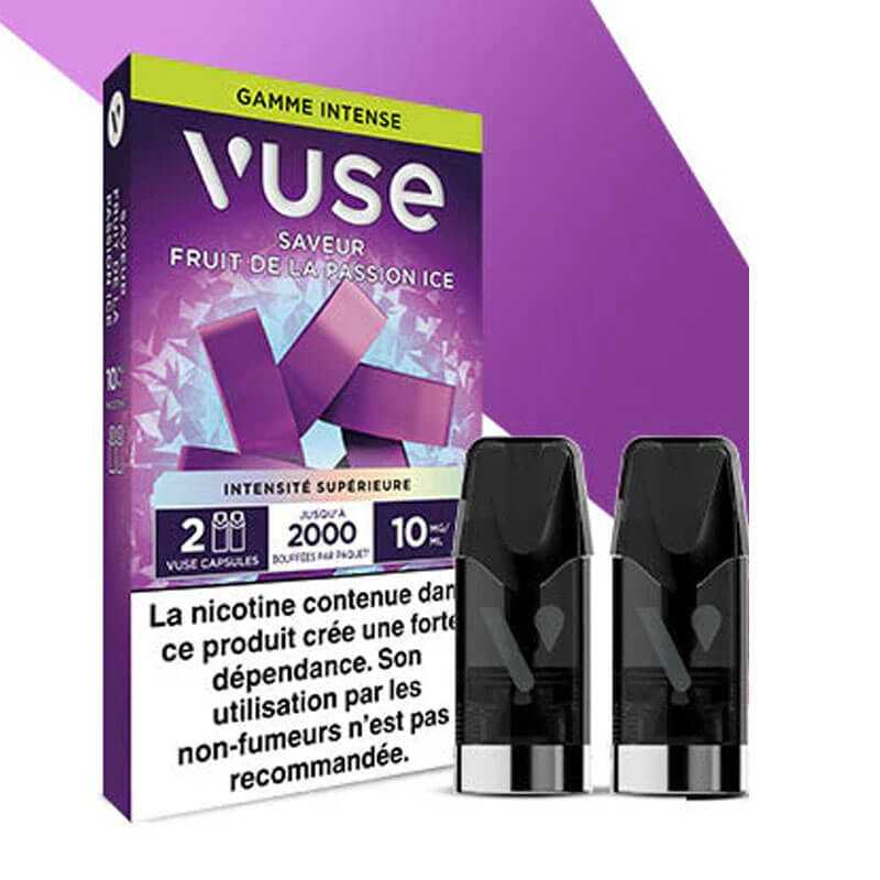 Ce paquet contient deux capsules saveur Fruits de la passion Ice, issu de la gamme Intense, avec des sels de nicotine. Chaque capsule contient jusqu’à 1000 bouffées*. Cette capsule est compatible avec Vuse Reload 1000 Box, Vuse PRO et Vuse ePod 2.