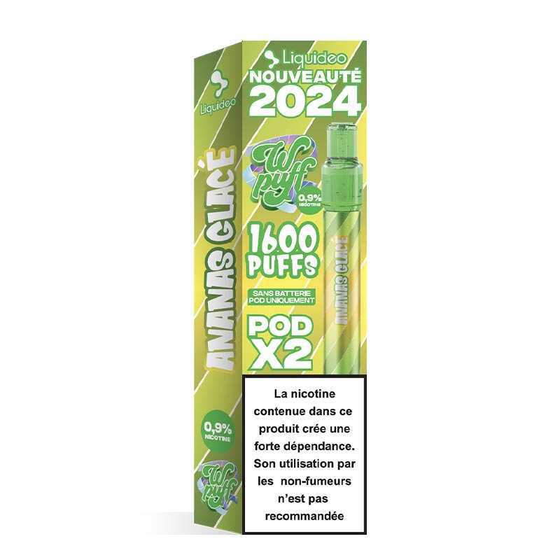 Pack de 2 cartouches Ananas Glacé pour la puff rechargeable Wpuff 2.0 Xperience de Liquideo. Saveur : Ananas, Frais. Contenance 2 x 2ml en 9mg ou 17mg de nicotine. Fabriquées en France. 800 bouffées par recharge.