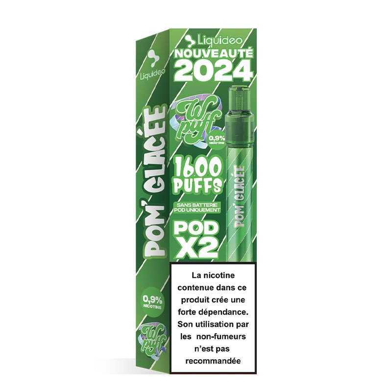 Pack de 2 cartouches Pom' Glacée pour la puff rechargeable Wpuff 2.0 Xperience de Liquideo. Saveur : Frais, Pomme. Contenance 2 x 2ml en 9mg ou 17mg de nicotine. Fabriquées en France. 800 bouffées par recharge.