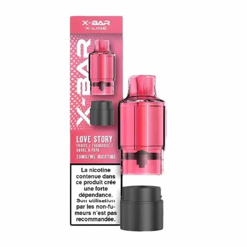 1 cartouche Love Story pour la puff rechargeable X-Line 15K X-Bar du French Lab. Saveur(s) : Barbe à papa, Fraise, Framboise. Disponible en 10mg et 20mg de nicotine - 15 000 bouffées par recharge.