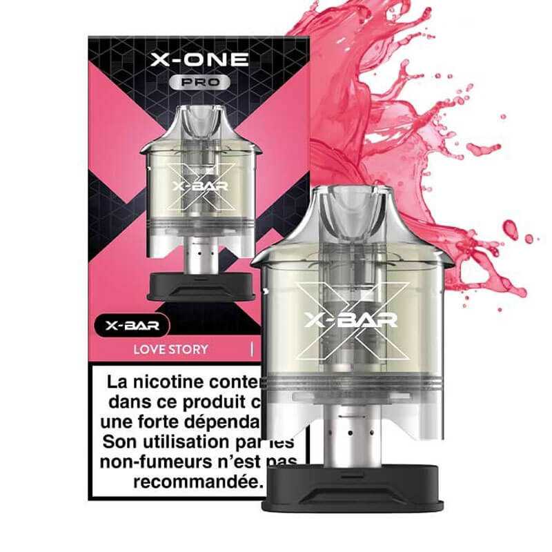 1 cartouche Love Story pour la puff rechargeable X One Pro X-Bar du French Lab. Saveur(s) : Framboise, Fraise, Barbe à papa. Disponible en 10mg et 20mg de nicotine - 15 000 bouffées par recharge.
